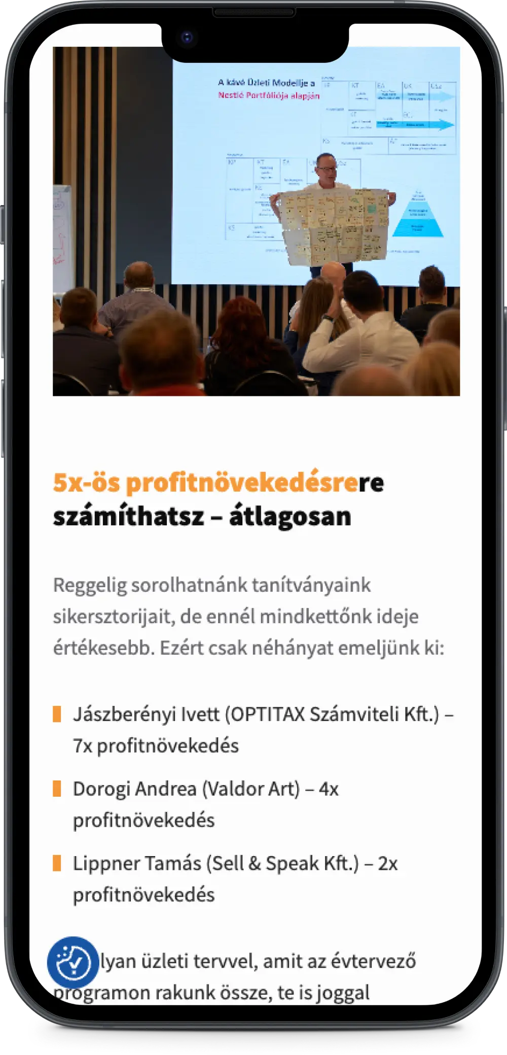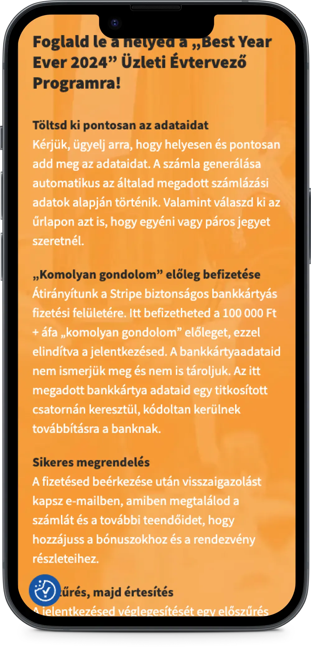 Egy olyan sales oldal, amely a hosszú tartalommal kapcsolatos tévhitekre rácáfolva nagyon is gördülékeny, jól fogyasztható. Ahol szinte észrevétlenül halad tovább egyik bekezdésről a másikra a látogató, egyenesen az üzleti eseményre való jelentkezésig.
