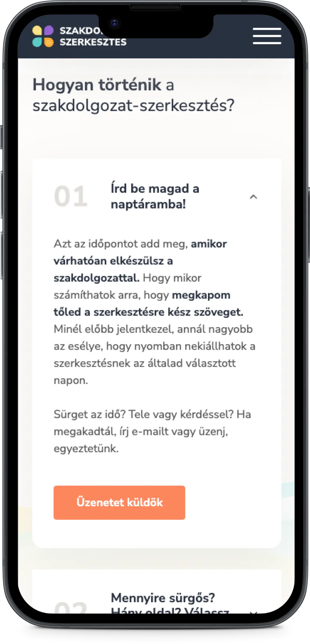 A szakdolgozat-szerkesztés iránt érdeklődők számára kulcskérdés az idő, hiszen vagy az utolsó percre halasztják a szerkesztést, vagy annyira elfoglaltak, hogy eleve kiszervezésben gondolkoznak. A weboldalon szinte pillanatok alatt el tudják dönteni, nekik való-e a szolgáltatás (akadhat, akinek nem világos, meddig terjed a hatáskör), megértik, miből áll a szakdolgozat-szerkesztés, és jó előre lefoglalhatják Reni idejét.